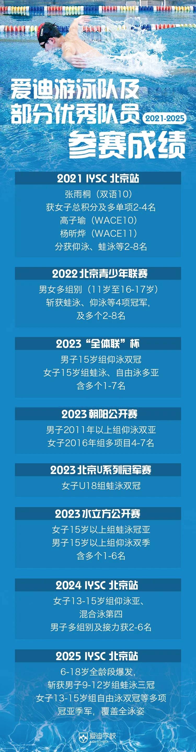 自2016年组建以来,爱迪游泳队从起步蓄力到赛场绽放,多年征战 IYSC 青少年游泳挑战赛、北京市青少年游泳联赛等多项权威赛事,覆盖 6-18 岁全龄段队员,累计斩获冠军 20+、亚军 18+、季军 15+!